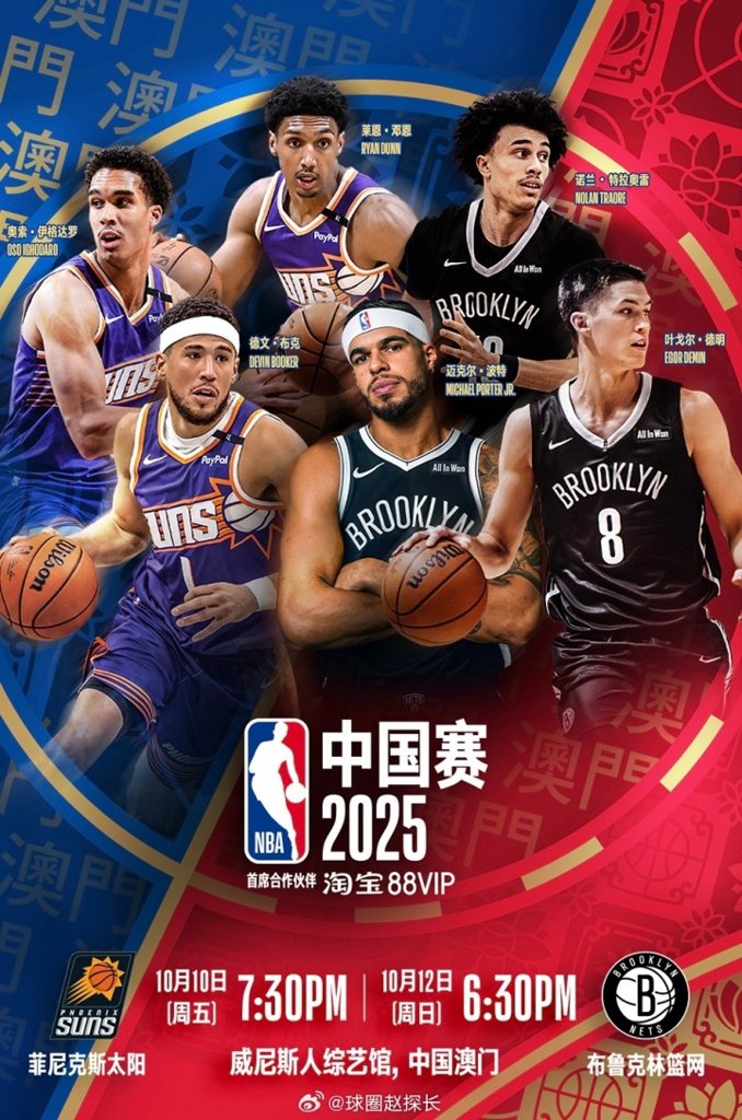 今年NBA中国赛将于10月10日、12日在澳门开打,对阵双方是篮网和太阳。